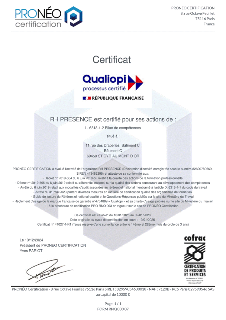 Nous proposons une prestation à valeur ajoutée, approfondie et personnalisée en fonction des éléments de contexte et du profil spécifique du bénéficiaire. Gage de la qualité de notre service, notre cabinet a été certifié Qualiopi pour les Bilans de Compétences au mois de Janvier 2022.